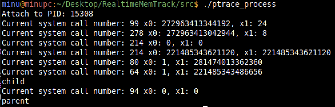 printf("Current system call number: %llu x0: %llu, x1: %llu\n", regs.regs[8], regs.regs[0], regs.regs[1]);
