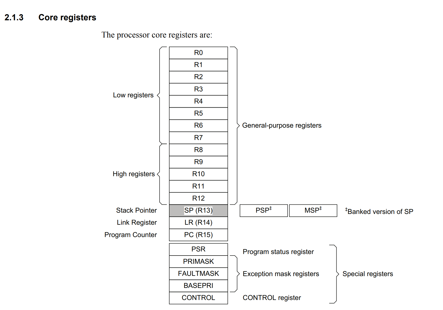 스택 포인터 레지스터(sp)말고도, msp(시스템/커널/인터럽트용), psp(사용자 task용)가 있음.