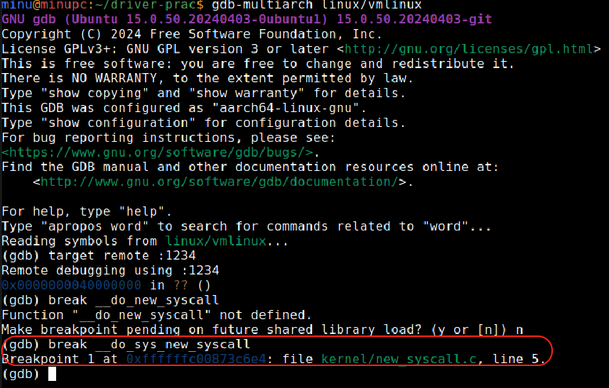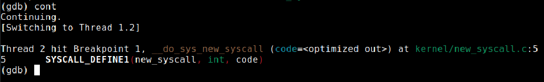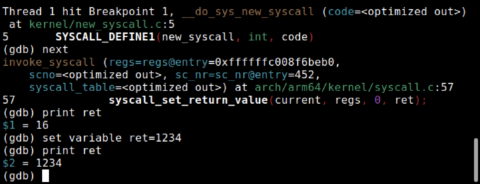 new_syscall 함수에 브레이크 포인트를 걸었다.