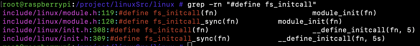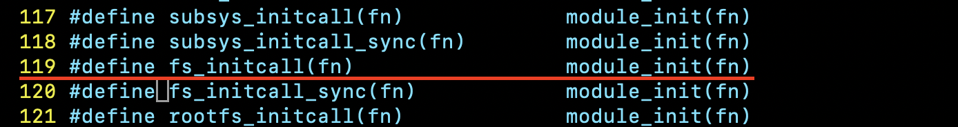 이렇게 나오고, fs_initcall은 include/linux/module.h의 119번에 정의되어있는 것을 알 수 있다.