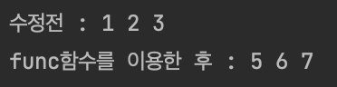 설명) func함수에서 배열 a의 주소가 인수로 전달된다. func함수에서는 받은 매개변수(배열 a의 주소)로 가서 값을 수정한다. 주소로 가서 값을 수정하는 것이기 때문에, 배열 a의 값을 출력해보면 변경된 것을 알 수 있다.