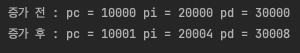 printf("증가 후 : pc = %u pi = %u pd = %u\n", pc, pi, pd);