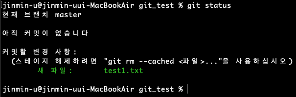 git status를 입력하면, 상태를 볼 수 있다. 커밋할 변경 사항 새 파일: test1.txt 이렇게 표시되어있다. test1.txt이 add되었다는 것을 의미한다.