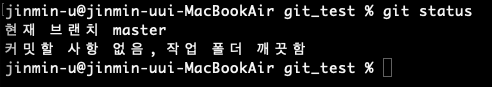 아까전에 add되었었던 test1.txt파일을 커밋했으니, 이젠 커밋할게 없다고 나온다.