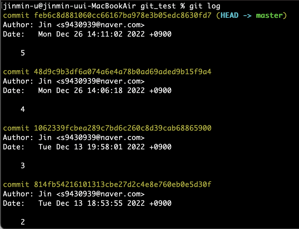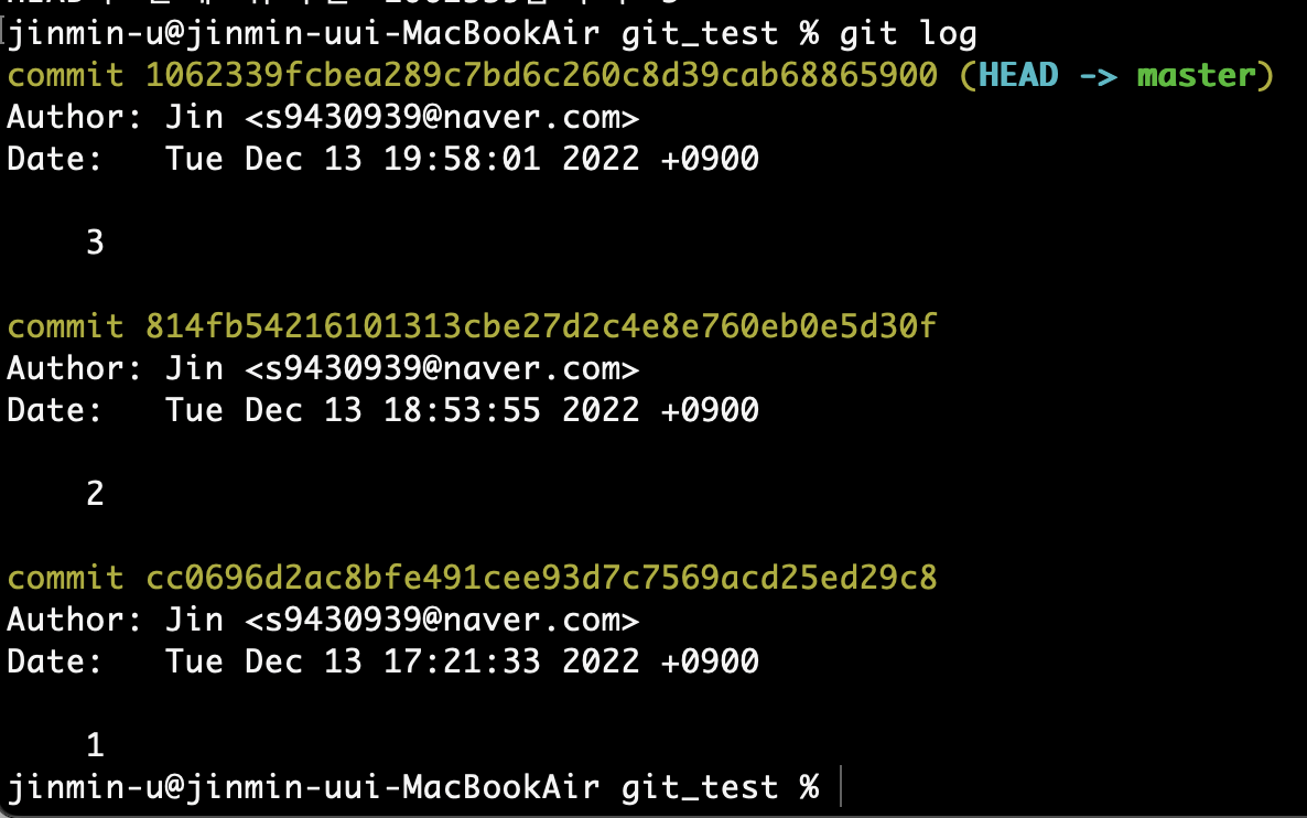 git log를 사용해서 3번 커밋으로 잘 되돌려졌는지 확인해보자.